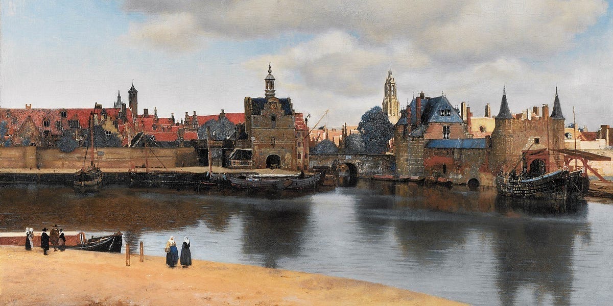 Later in the book, one of the writers the narrator models himself against, Bergotte, is looking at this Vermeer painting, View of Delft, and he becomes obsessed with how, even in this large landscape, Vermeer paints the little patch of yellow wall towards the right of the painting so perfectly.
